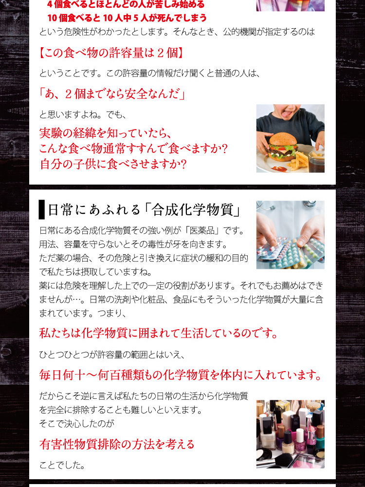 - 植物灰化物抽出末(ヒバマタ、ホンダワラ、アラメ、ワカメ、コンブ、タケ、スギ、ヒノキ、マツ、ヨモギ、イタドリ若芽、クマザサ、カヤ)、還元麦芽糖水飴、デキストリン、穀物発酵エキス、赤ワインエキス末(レスベラトロール含有)、アガリクス末、霊芝末、ヤマブシタケ末、メシマコブ末、米粉、プロポリス、マイタケ菌糸体末、マンネンタケ末、モズク抽出物、メカブ抽出物(フコイダン含有)、セルロース、ステアリン酸カルシウム、微粒酸化ケイ素、(原材料の一部に小麦含む)